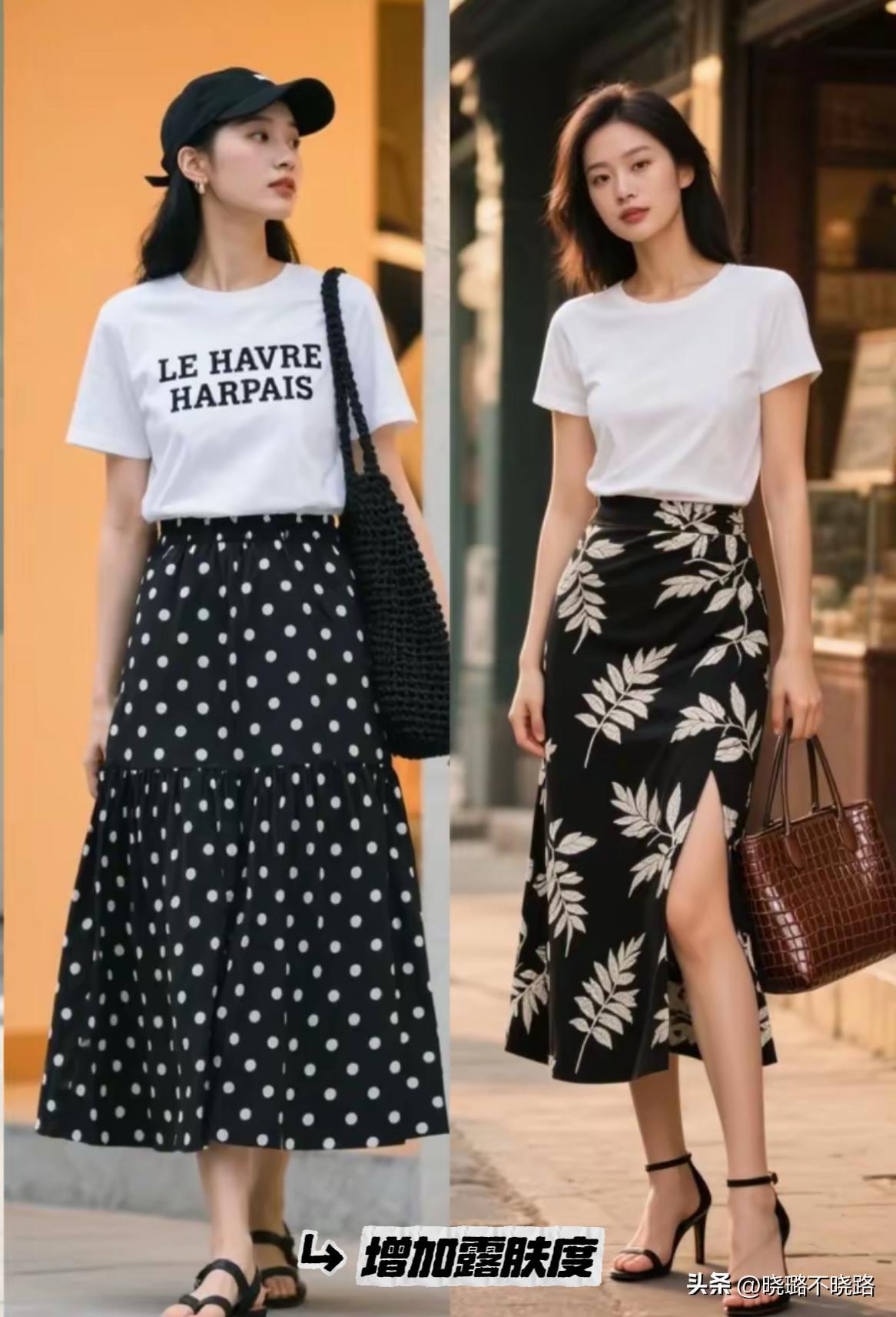 想要走優雅知性的路線,穿白T恤就不要配褲子了,換成及腳踝長度的闊擺長裙,安全感爆棚,而且也不用擔心雙腿會被曬黑了,天然的“物理防曬”比化學防曬更有效。