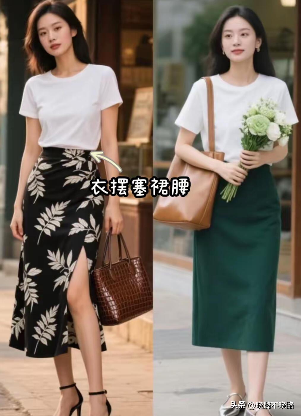 越是面對款式基礎的單品時,越要運用好正確的穿搭技巧,白T恤無論是配褲子還是裙子,都要用到“上衣塞腰”的方法,如果直接將衣襬露出來,就很容易有五五分的情況。