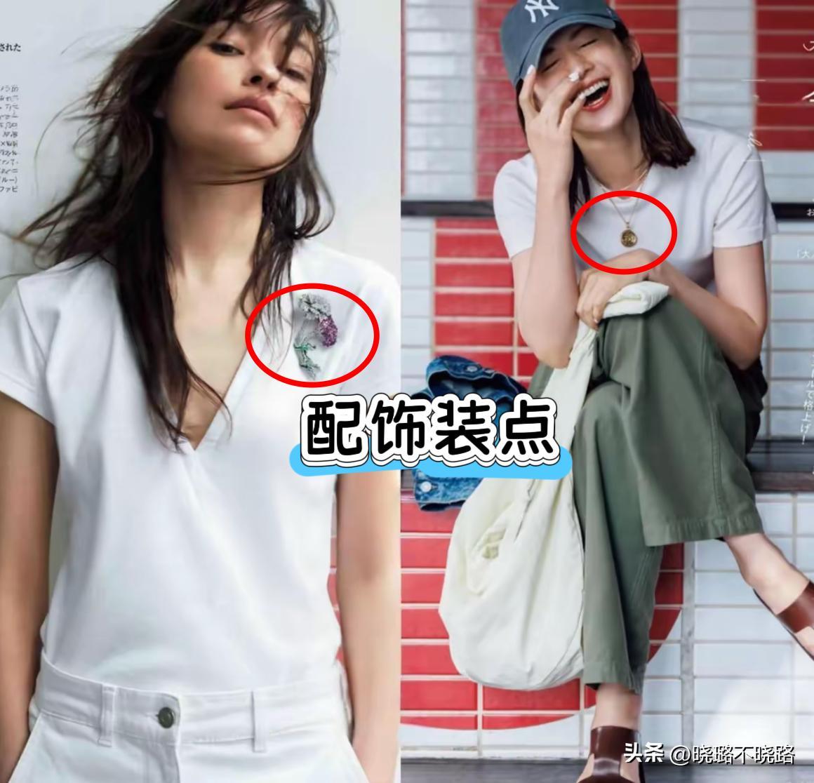 最後就是關於配飾的點綴,很多人覺得配飾不重要,所以就會導致造型很單調無趣,實際上,穿白T恤只需要佩戴一款胸針,或者戴頂棒球帽,戴根精緻時髦的項鍊,立馬就能豐富造型,讓白T恤的魅力徹底釋放。