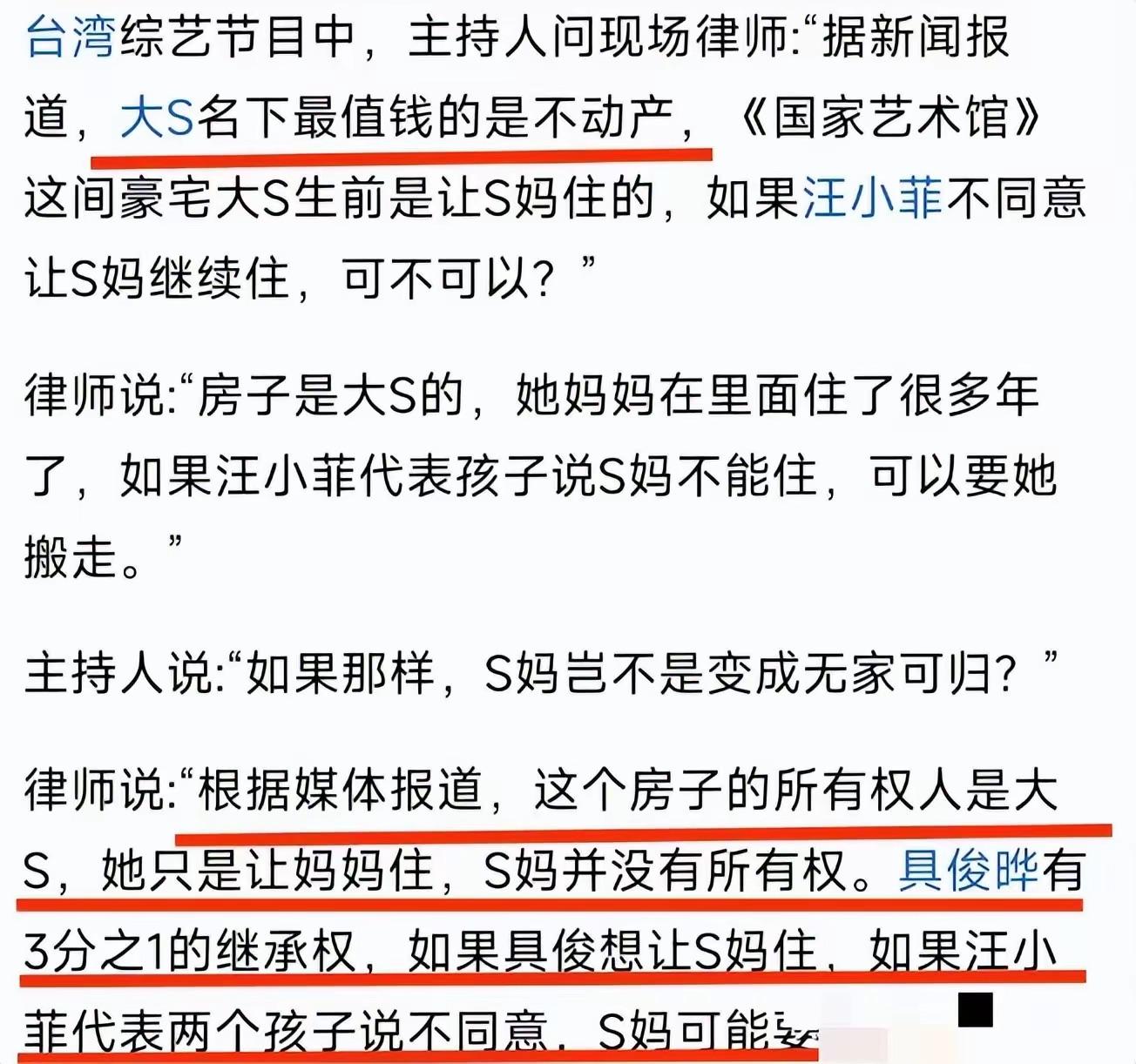 現在S媽還住在《國家藝術館》豪宅裏,這間豪宅也是大S生前讓S媽住的,但是房子是大S的,不是S媽的。