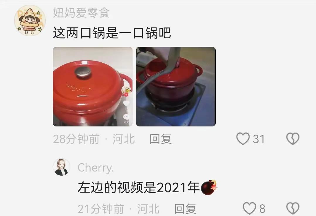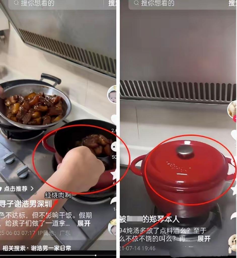 原本是想表達自己的一片慈愛之心,不曾想萬能的網友挖出紅色琺琅鍋的“祕密”。大概是在21年鄭琴的視頻裏,也出現了同樣一口鍋。