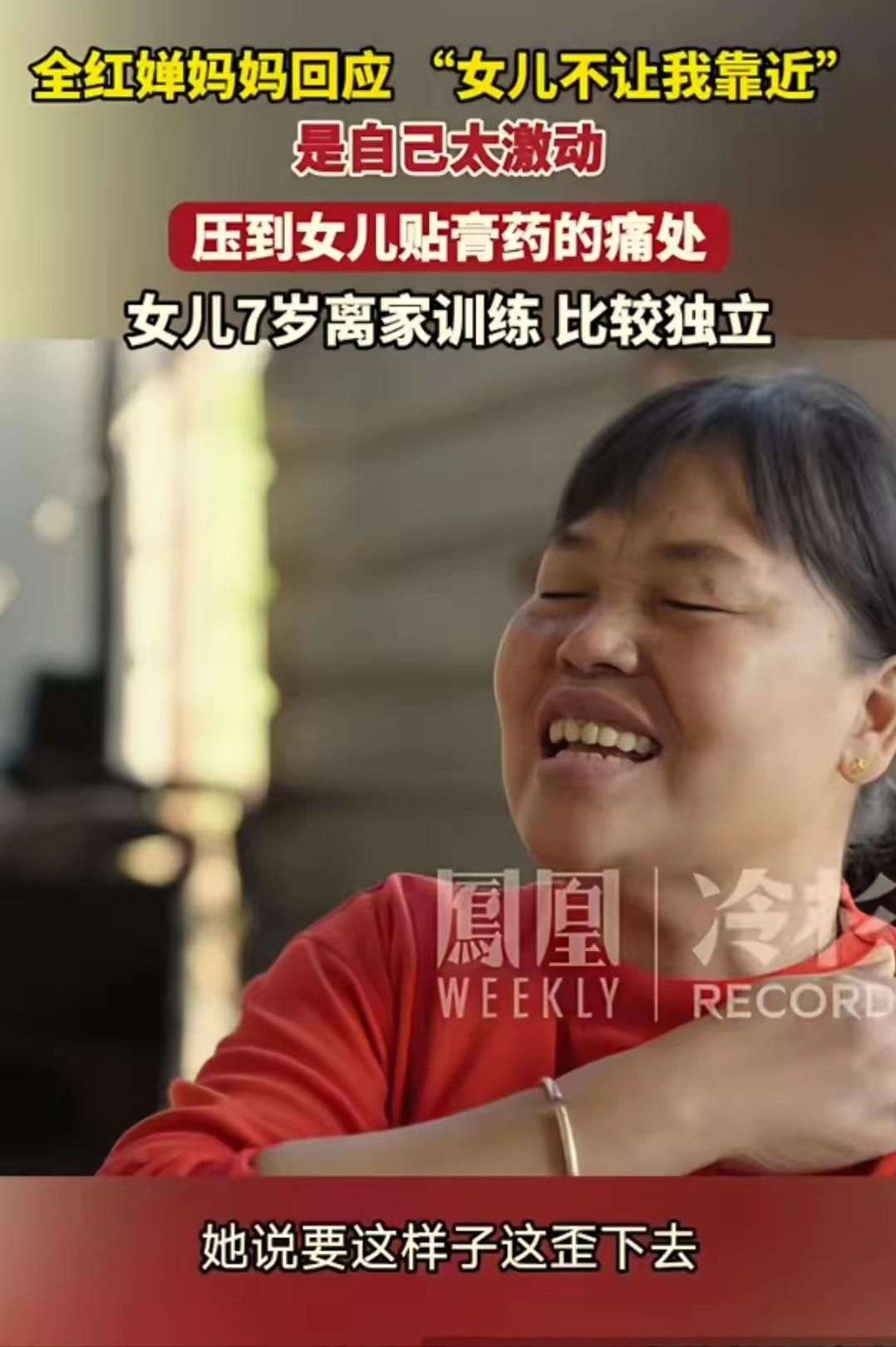 還有全紅嬋回老家的時候,全媽媽一隻手搭在全紅嬋肩膀上,全紅嬋趕緊推開了。這個動作又被質疑全紅嬋媽媽和女兒關係不好。