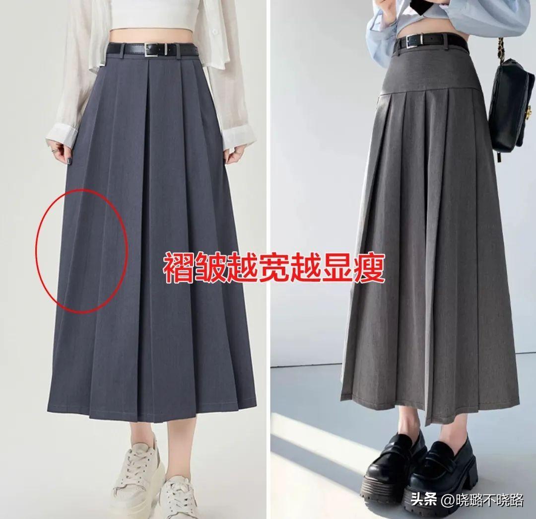 百褶裙的褶皺設計,充滿了青春的活力與浪漫的氣息,是減齡的絕佳選擇,對於梨形身材或腿部較爲粗壯的女性而言,百褶裙的寬鬆裙襬能夠巧妙地遮掩下半身的不足。同時百褶裙的褶皺設計還能夠增加裙子的層次感和動感,讓穿着者在行走間散發出迷人的魅力。
