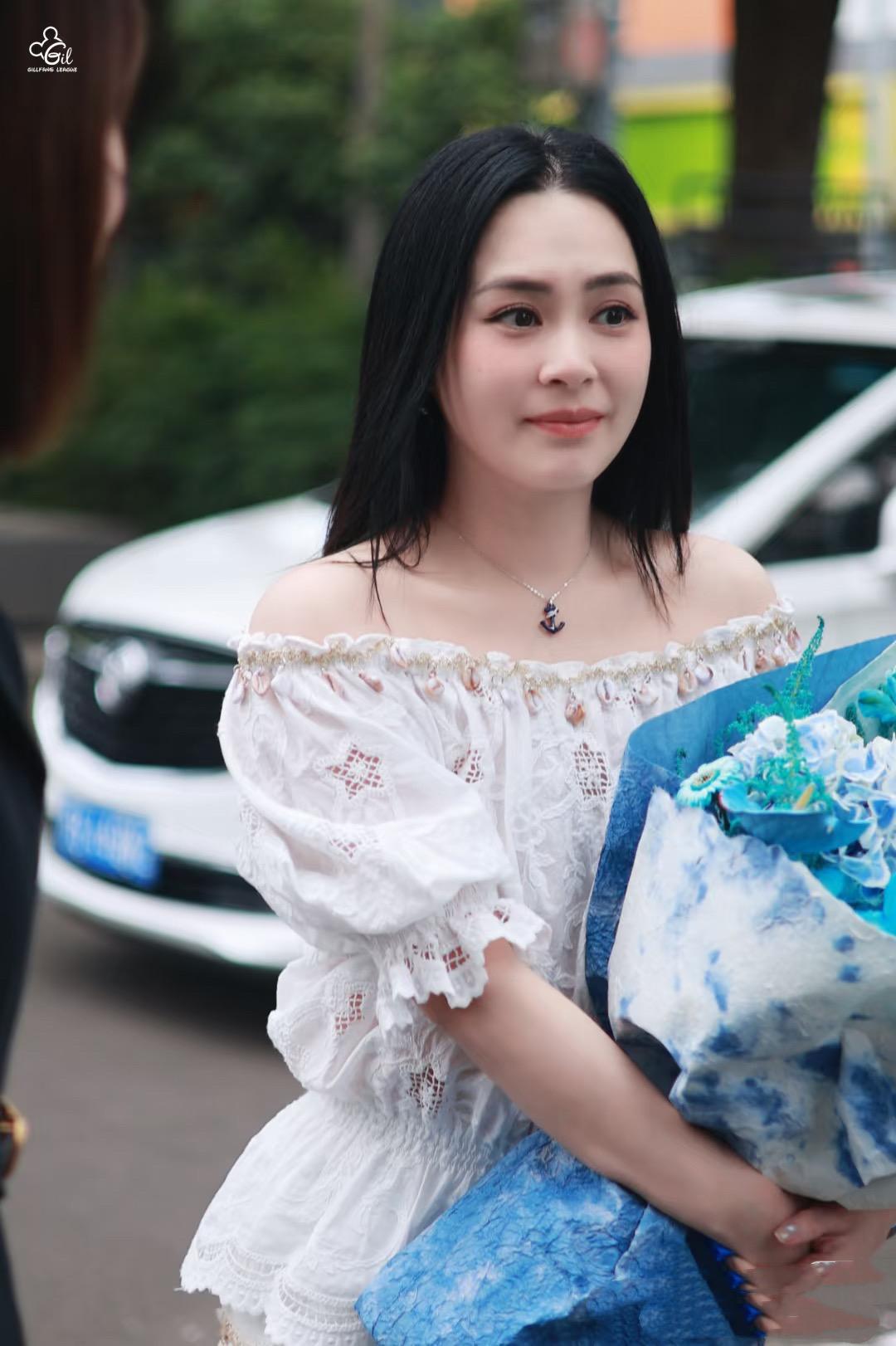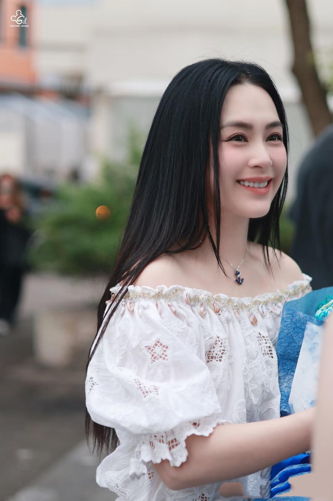 在活動現場,阿嬌也表現的端莊大氣。穿着一字肩的白色蕾絲裙,微笑着錄節目。她都已經44歲了啊,這狀態真是像極了20出頭的女孩子。