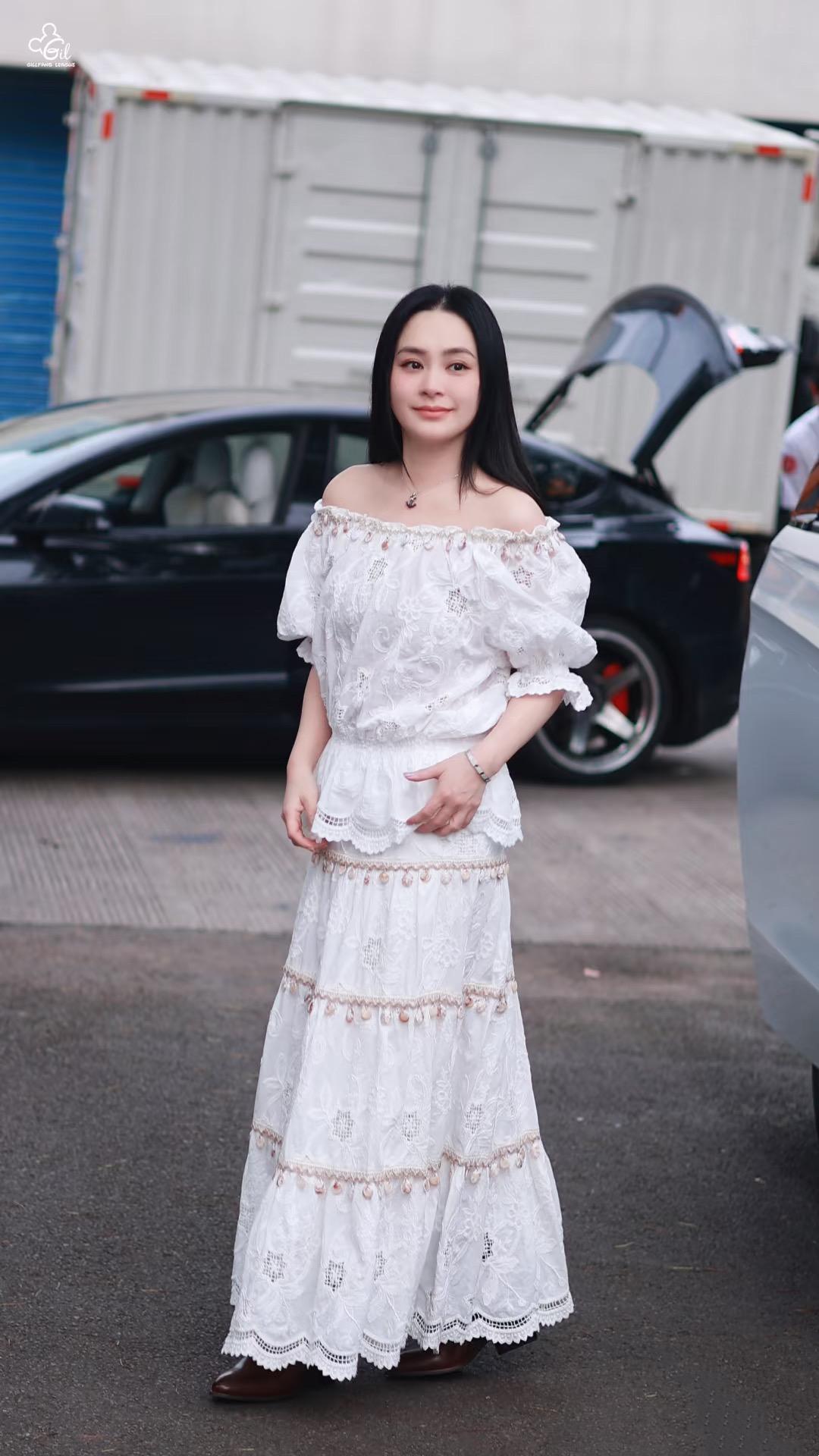 阿嬌換上了白色蕾絲套裙,整個人有一種溫柔大氣的美。這種白色蕾絲套裙,顯得她嫺靜高貴,整個人白到發光。