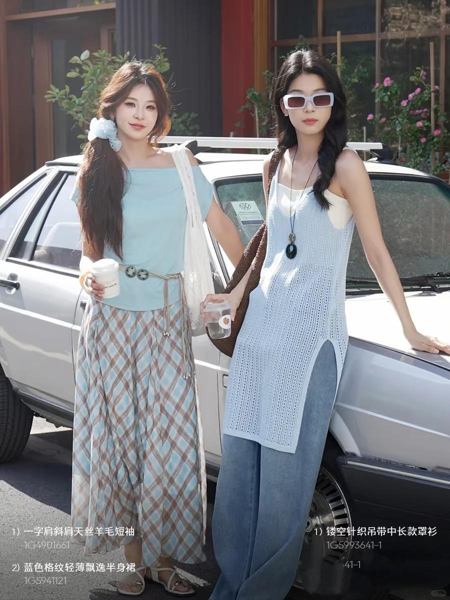 純色+印花都組合,也是一種常見的搭配方式。比如上衣純色系、半身裙選擇格紋印花,就很復古也很甜美,有一種俏皮減齡的感覺。