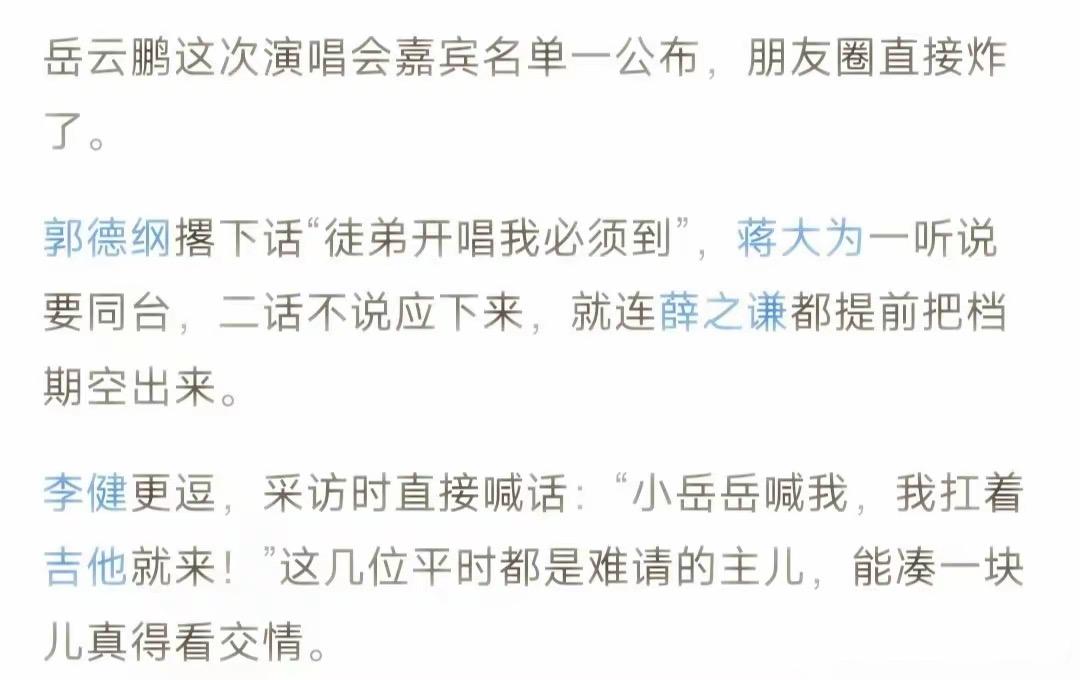 岳雲鵬這演唱會,光老藝術家就足夠讓人心動了。更何況還有很多年輕的歌手呢,要說娛樂圈的人脈,岳雲鵬是真不錯。