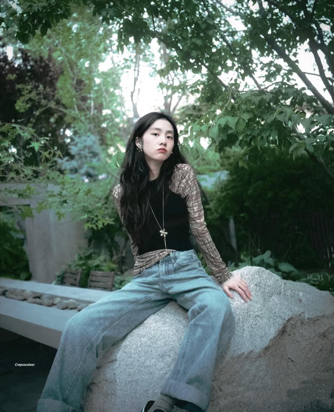 這種修身的香芋紫打底衫,配高腰的牛仔褲,就是青春美少女該有的模樣。修身的打底衫,顯得黃多多腰身纖細,身材玲瓏。