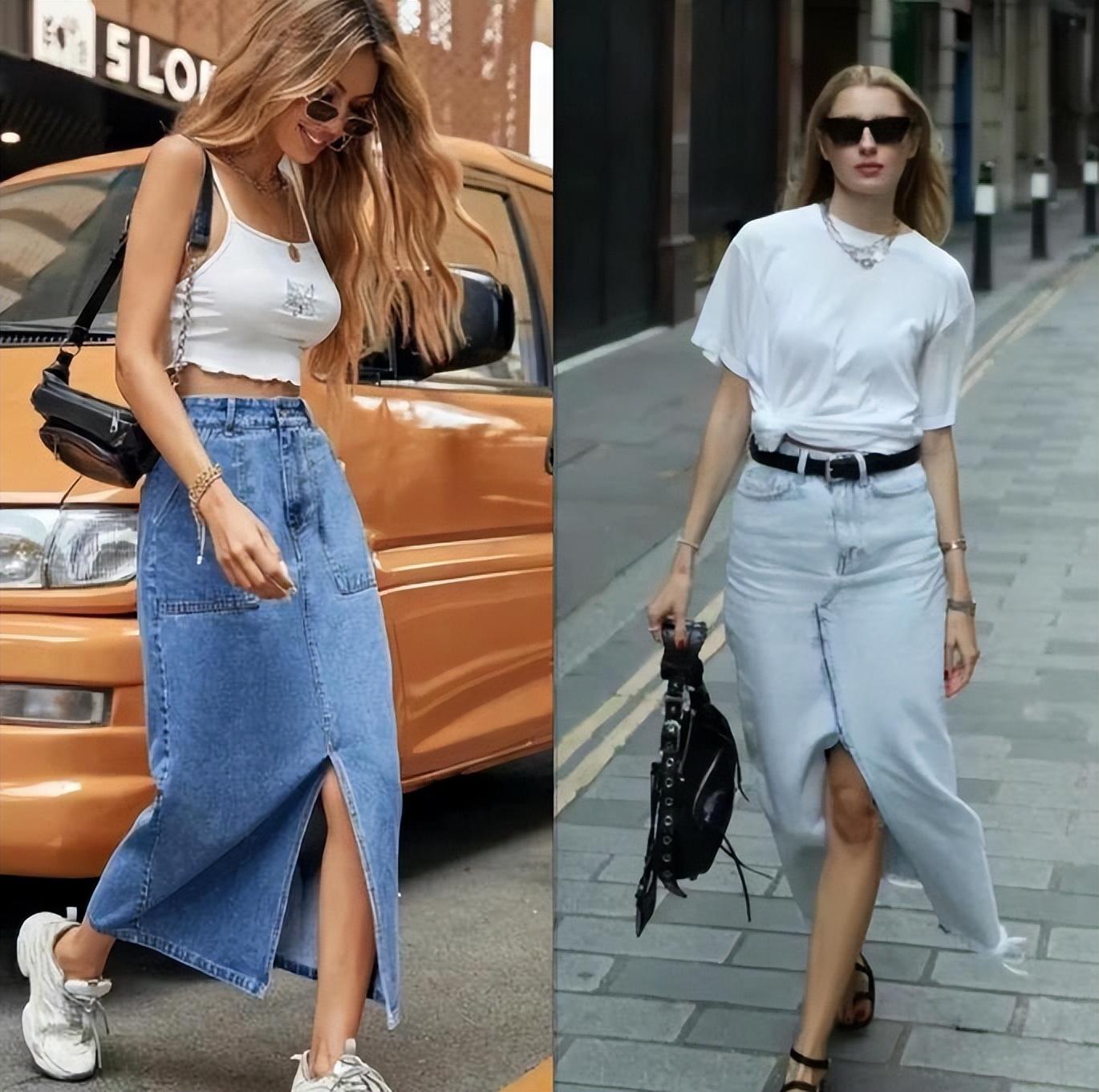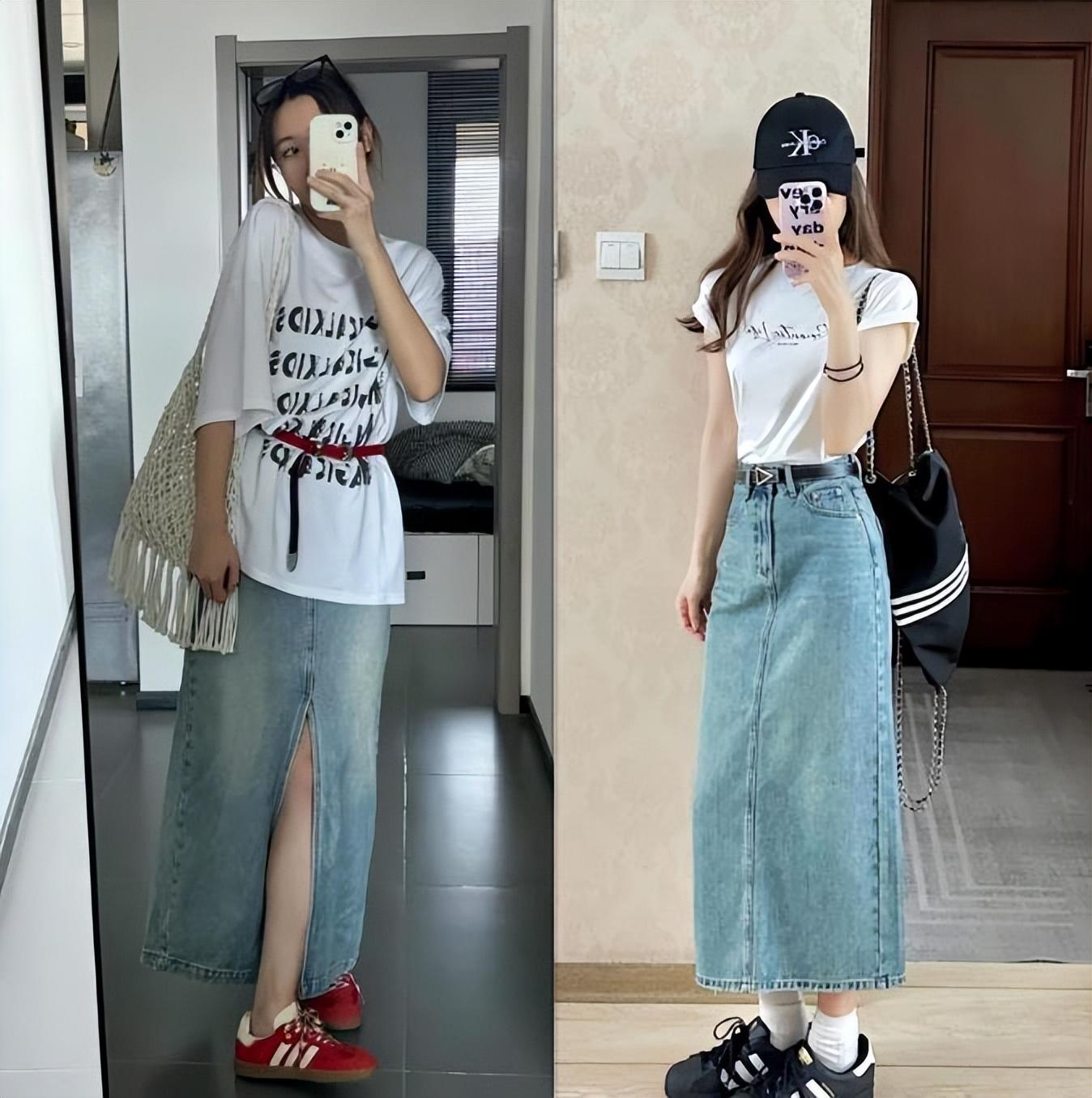基礎款的白色t+藍色直筒開叉牛仔半裙,這種看似簡單的造型,實際上很好看時髦,也帶着滿滿的洋氣與青春感,選擇一條腰帶和項鍊進行點綴,就能瞬間提升整個造型的時髦度和細節感。