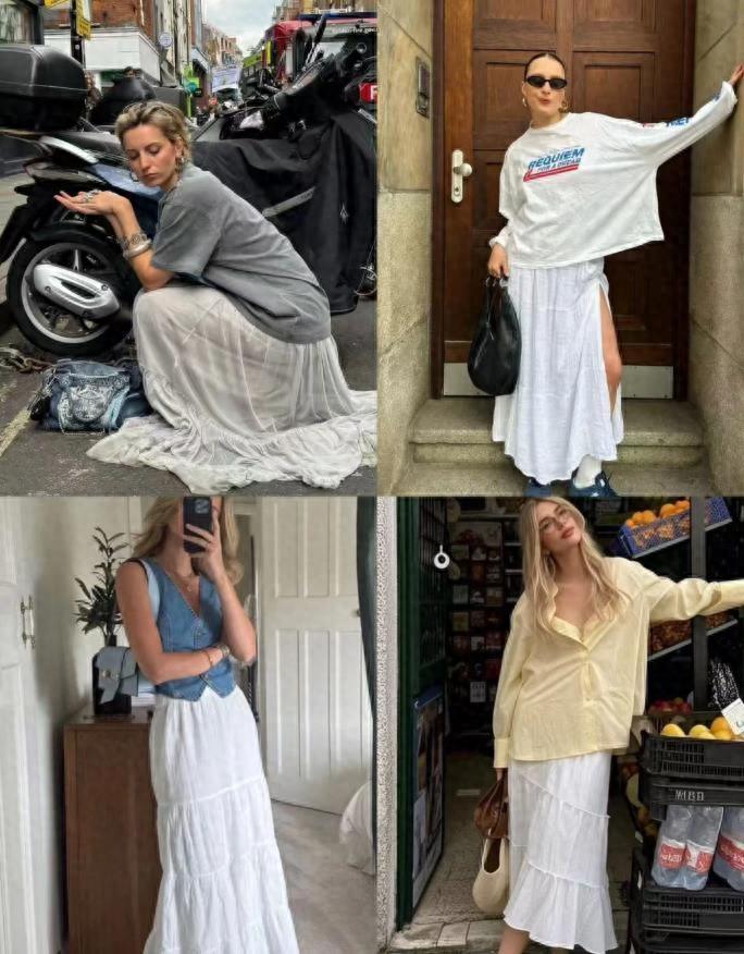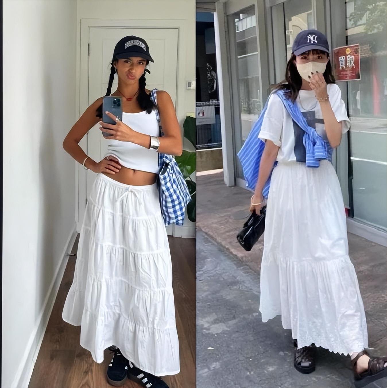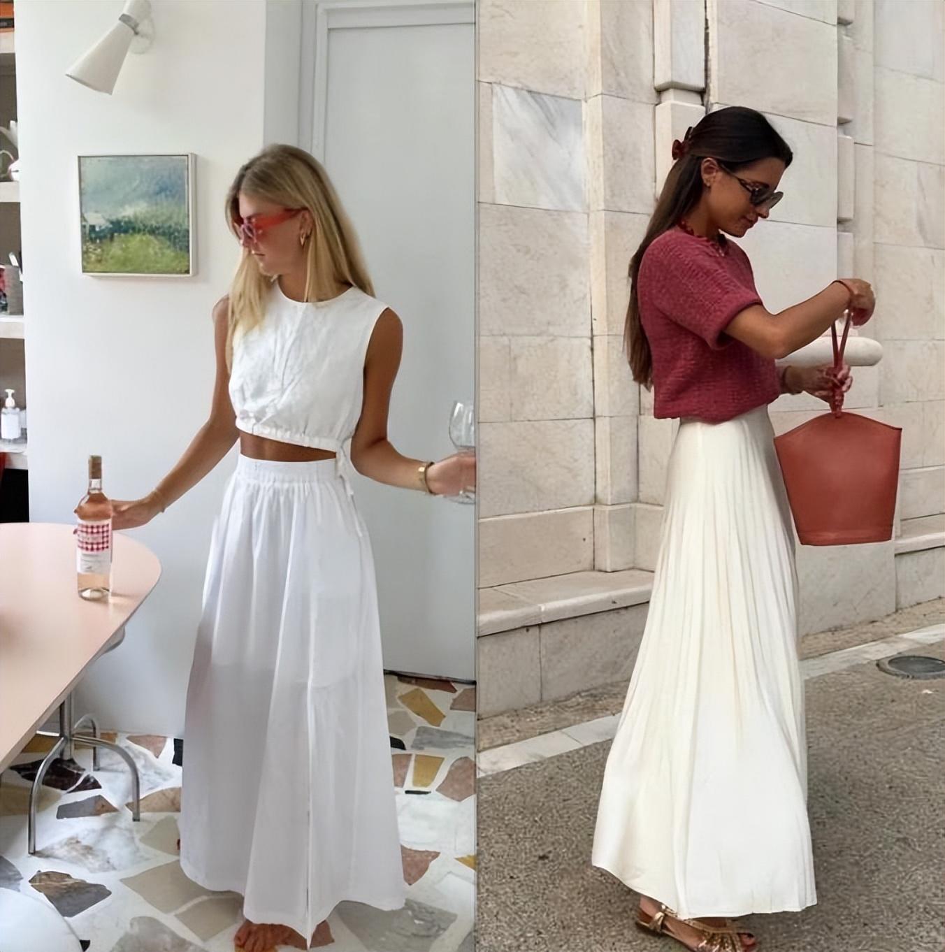 在挑選這條白色過膝半裙時,要選擇帶有拼接和壓褶設計的白色長裙,這樣輕鬆打造出層次感,搭配簡單的基礎款白t,優雅又不失活力感。