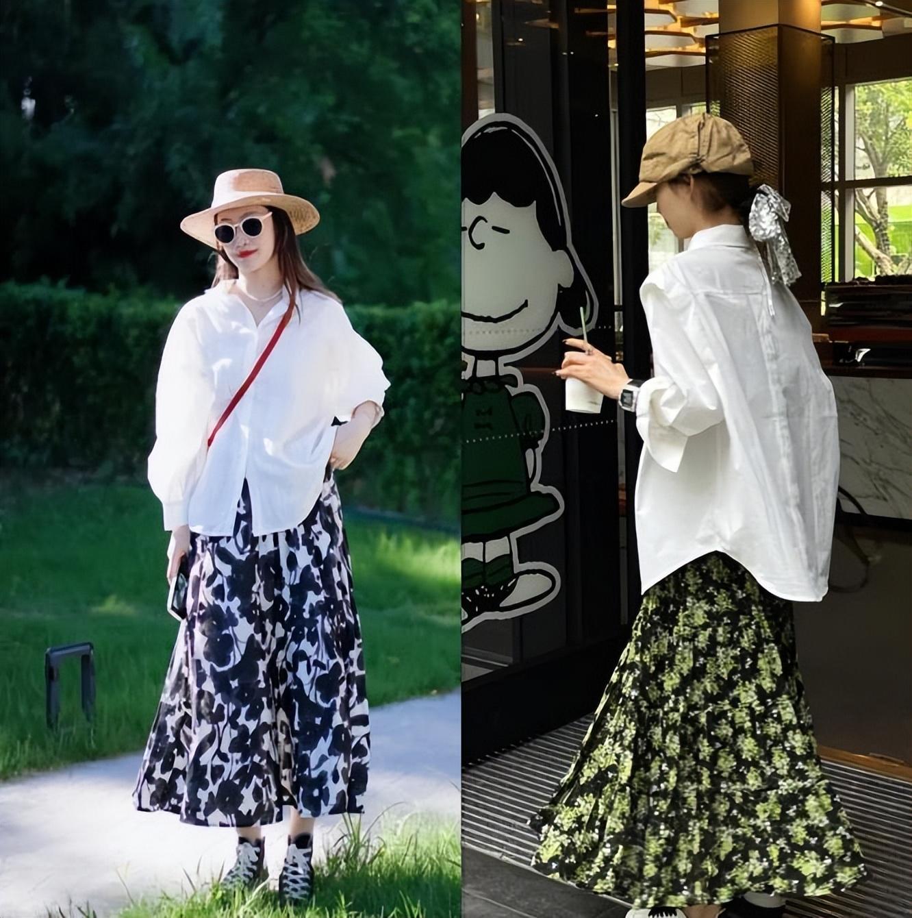 碎花過膝半裙與襯衫的搭配,幹練知性又不失浪漫,這樣的組合可以碰撞出滿滿的夏日風情,優雅還不失趣味感。