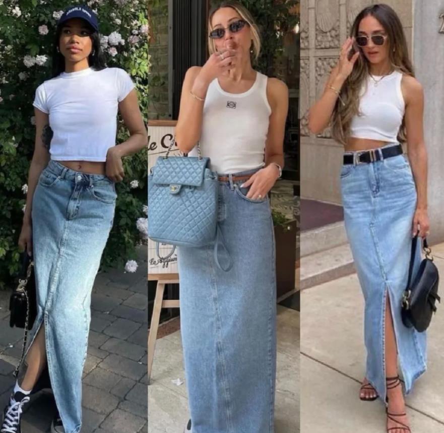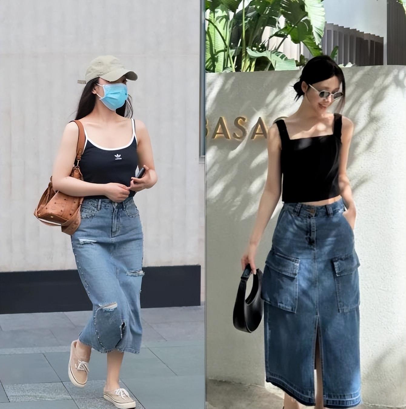 深藍色開叉牛仔裙+白色緊身小背心,鬆緊的組合,很好優化了身材比例,這個組合給人一種“呼吸感”,優雅利落還顯瘦,減齡效果可是一流的。