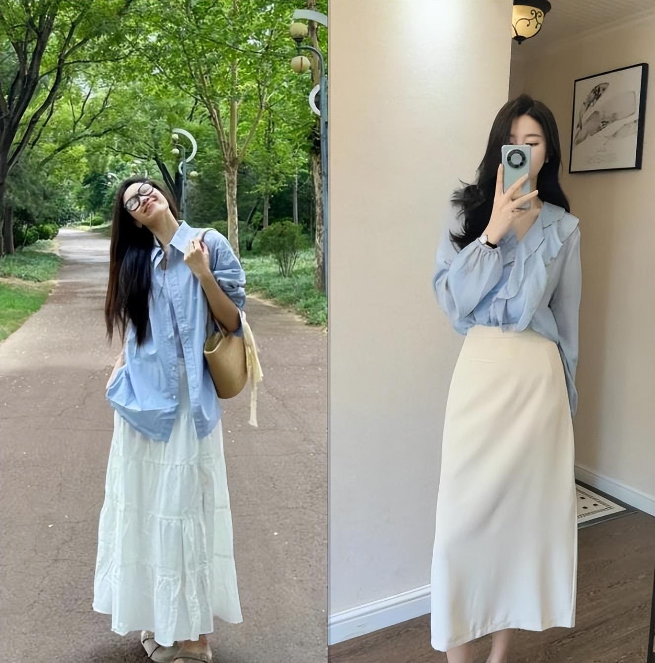 直筒版型的白色過膝半裙,線條感流暢,上衣配一件淺藍色襯衫,藍+白的配色,清爽乾淨又自帶高級感,夏天這樣的裝扮,可以在視覺上給人一種降溫效果。