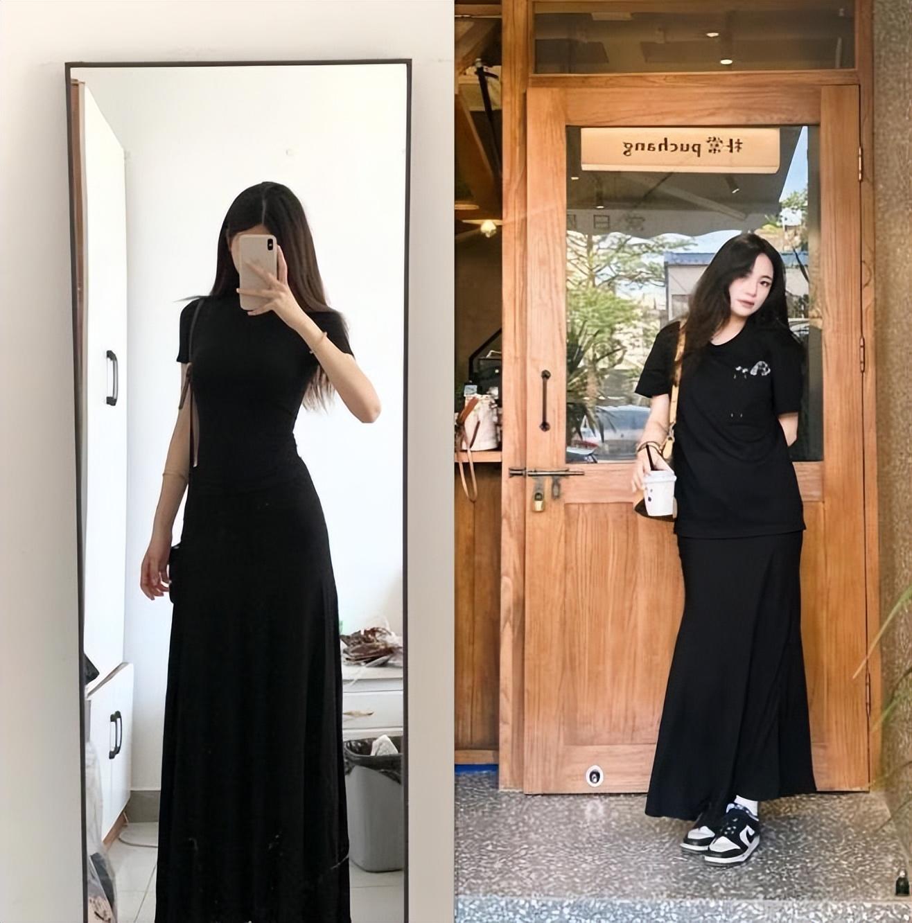 對於這種直筒版型的黑色長裙,相信很多女性都會喜歡的吧?貼合身材的剪裁,可以很好勾勒出曼妙的身姿,上衣搭配一件黑色小t恤,視覺上顯瘦又高挑,加入項鍊和搭配一雙尖頭單鞋,下身的比例瞬間就被拉長了。