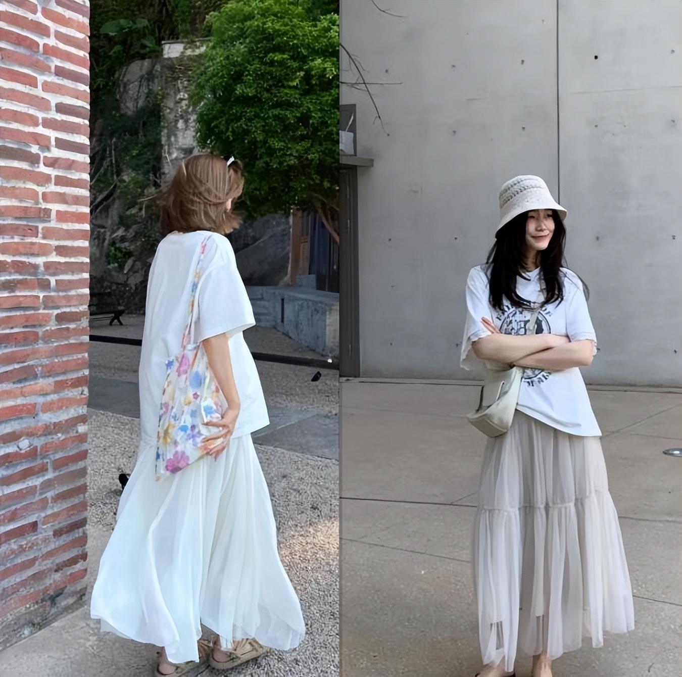 溫柔浪漫的白色薄紗過膝半裙,自帶仙氣感,搭配休閒白色t恤和同色鞋子,上下配色一致,高級又省心,再利用一條白色珍珠項鍊點綴,溫柔優雅的女人味就打造了。