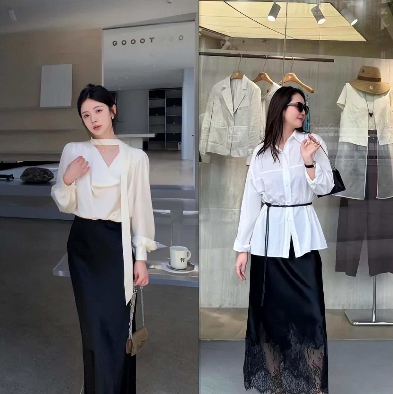 白色飄帶襯衫+黑色過膝半裙,經典的黑白配,最時髦又不會出錯了,可以爲夏日的穿搭注入一絲知性優雅感,打造出高級感與氣質。