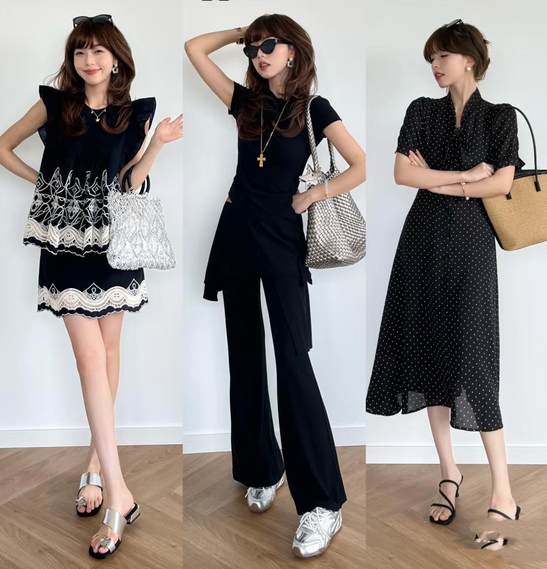 如果是連衣裙的話,可以搭配波點的元素,波點連衣裙、綁帶的高跟鞋,精緻又溫柔。如果想更酷一點,一身黑配墨鏡吧,太颯了。