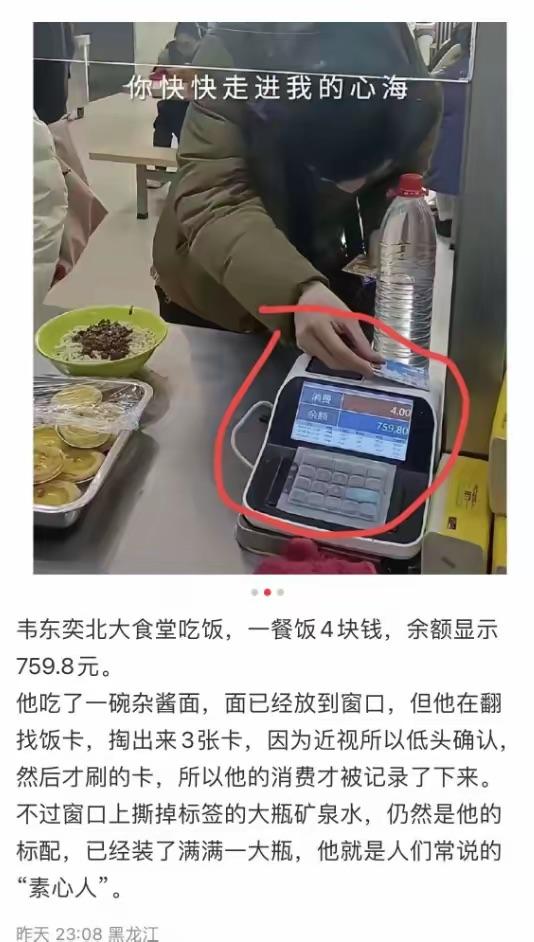後來韋東奕打了一份4塊錢的炸醬麪,然後還盯着刷卡機看了一會。顯示卡內餘額759.8,難怪說韋東奕一個月的生活費只要300塊。