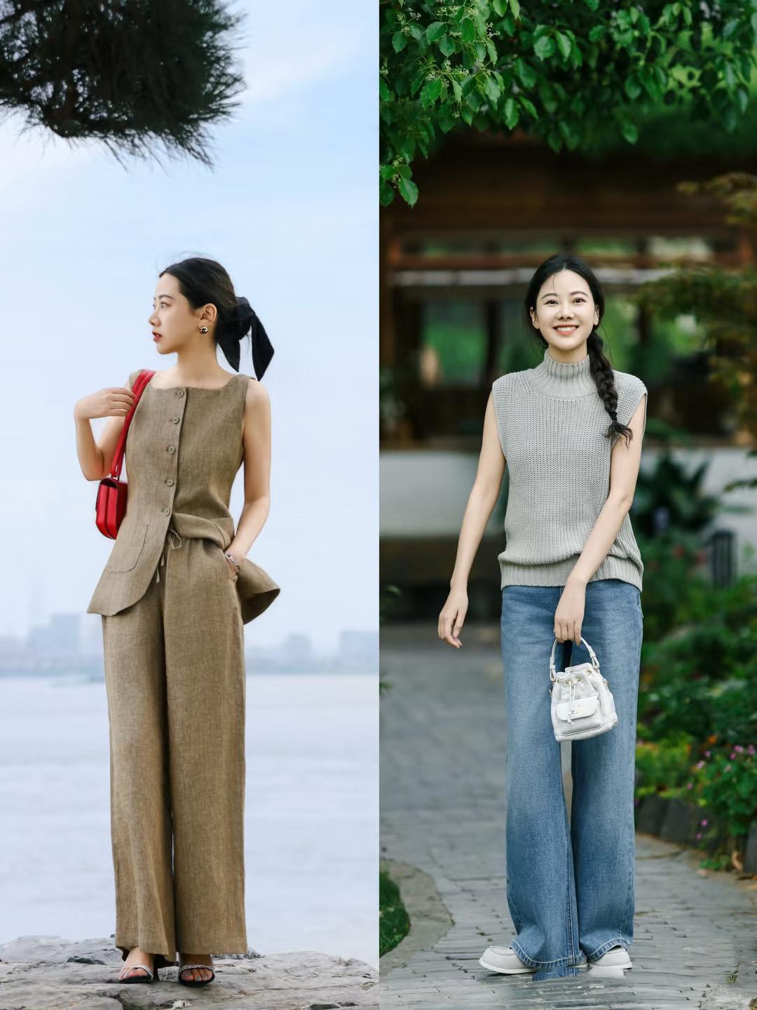 偶爾嘗試簡約的套裝,也會讓我們的打扮更有氣質。馬甲+闊腿褲,這種組合太常見了,高馬尾的髮型,很利落、也顯精神。
