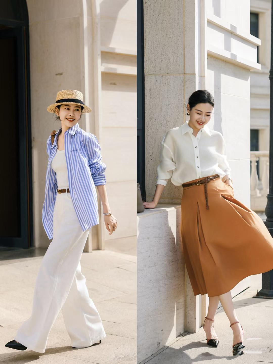 寬鬆的條紋襯衫,修身的小背心,乾淨的白色直筒褲,這搭配、簡直就是抄作業必備的模板。休閒、上班、度假,都可以穿。