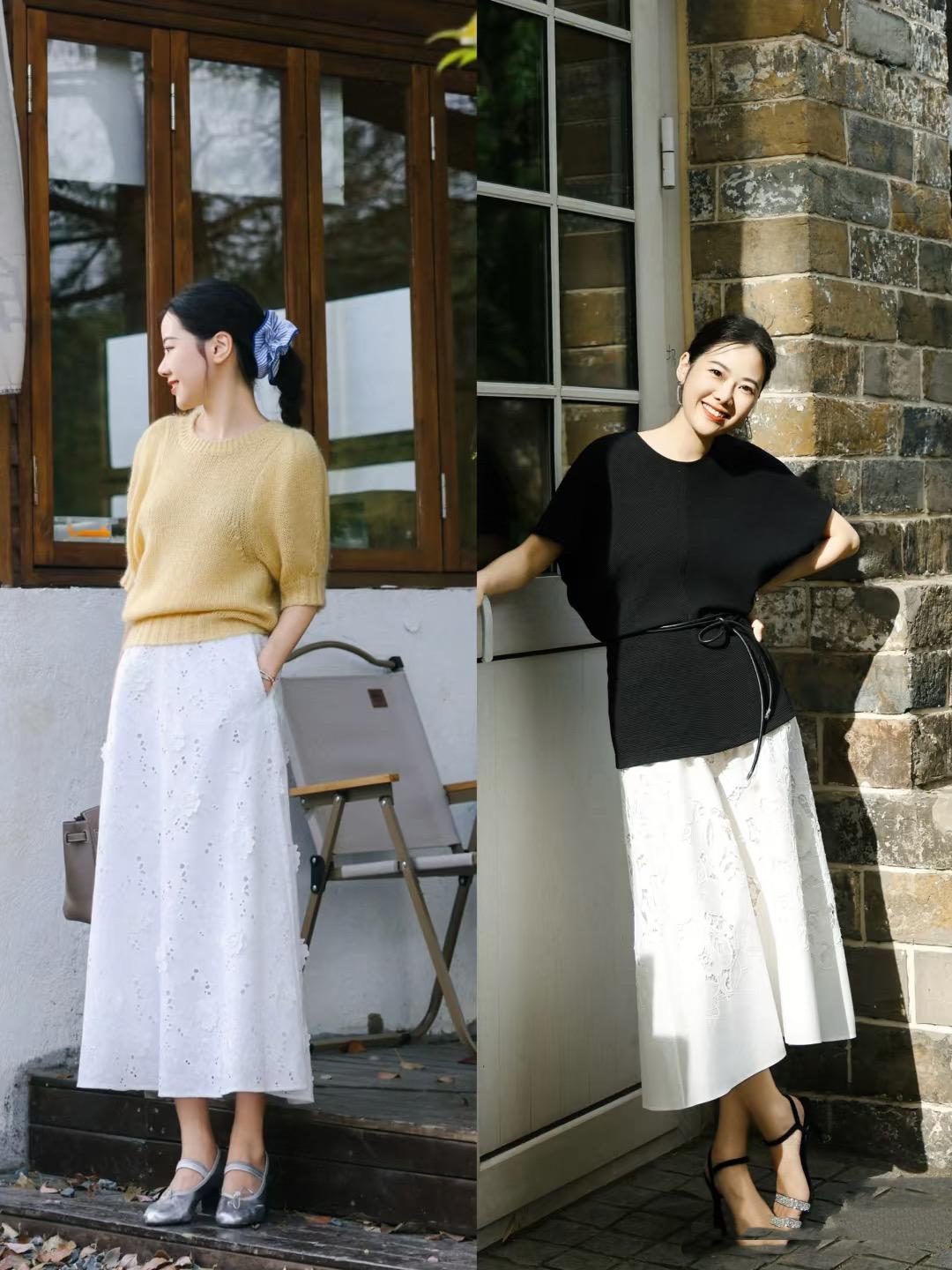 寬鬆一點的黑色T恤,原來也可以穿得休閒又精緻。黑白配、經典高級不過時。黑色T恤、白色蕾絲半身裙,穿起來簡潔又有女人味。