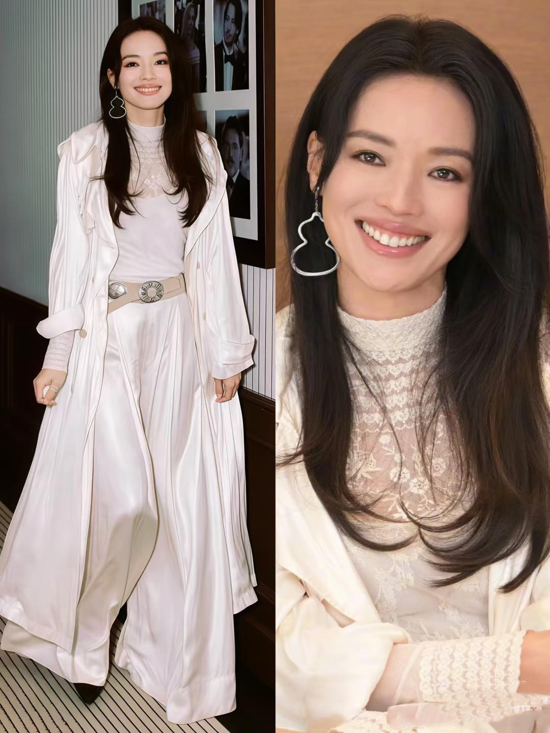 以白色系爲主色調,搭配長款風衣的設計,很輕薄的面料帶着珠光質感,有一種很溫柔甜美的氣質,顯得舒淇氣色很好,也超級減齡。
