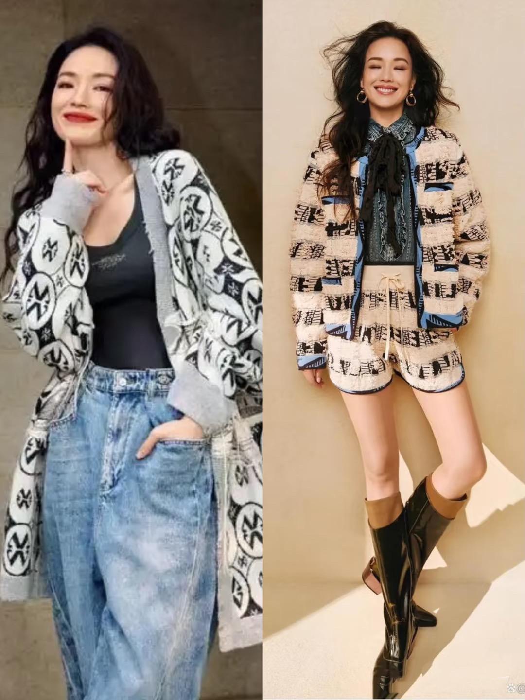 鬆弛不等於隨意,舒淇的穿搭也是有自己的態度。印花突然的開衫,就很容易穿出鬆弛又高級的時尚範。