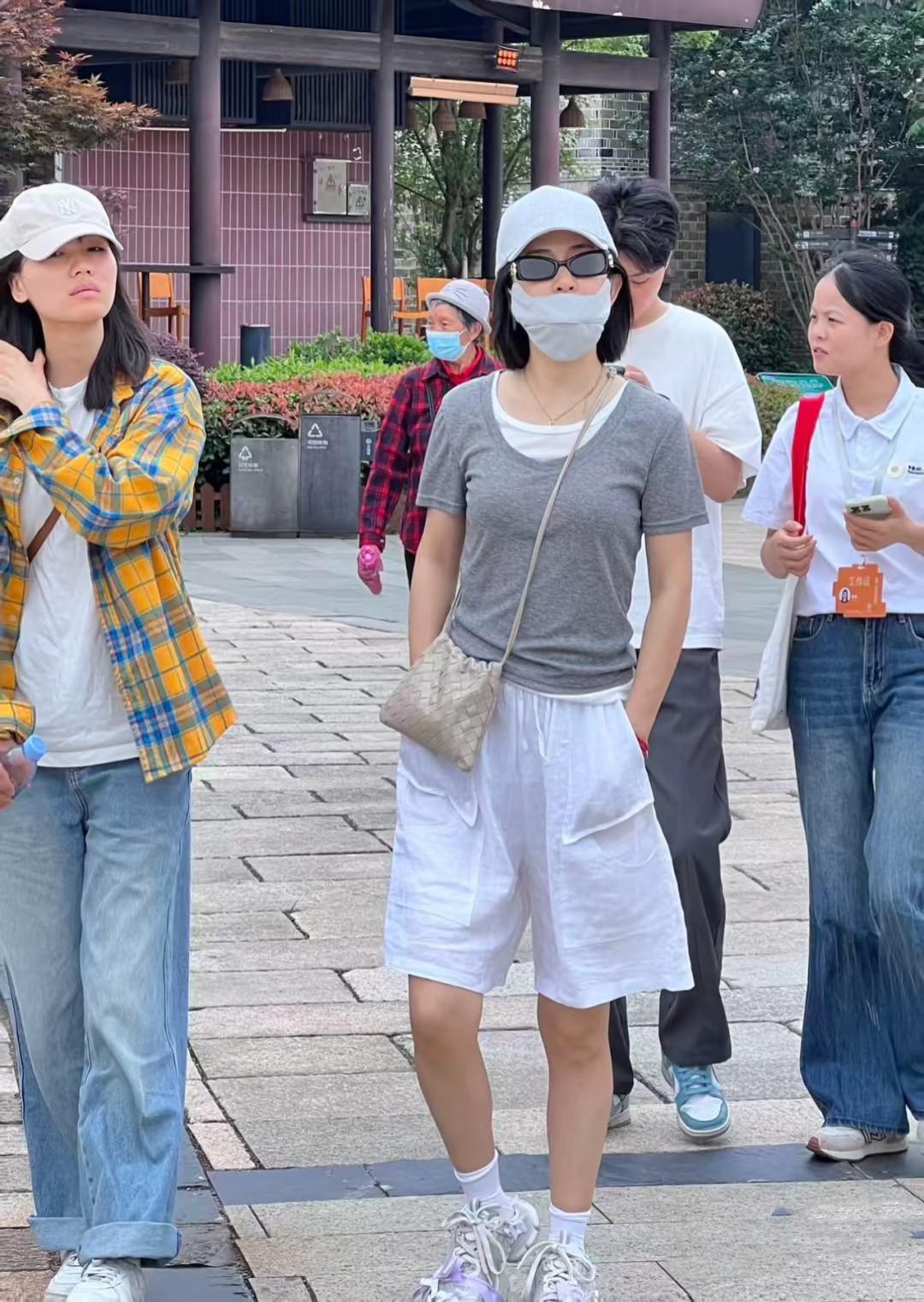 帶着白色棒球帽,捂着臉基尼,防曬工作很到位。兩件套的T恤、白色大褲衩子,乾淨清爽。