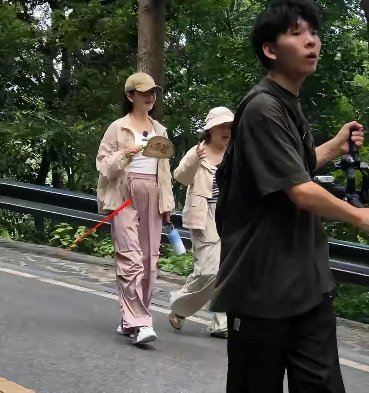 當天謝娜穿着白色小背心、粉色闊腿褲、米色的防曬衫,還配戴了一頂鴨舌帽。這打扮很清爽、也超級減齡。