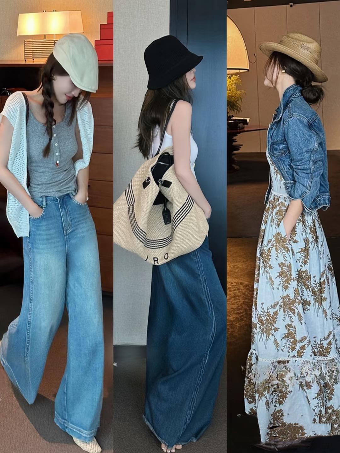 像這種白色小背心、高腰的牛仔褲,就是非常簡單單大半年。收腰小背心、藍色闊腿褲,可以配漁夫帽、大大的包袋,潮流又洋氣。