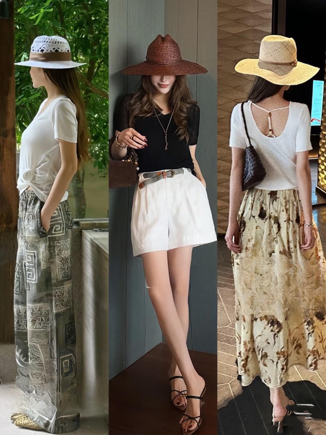 寬鬆的印花褲子、浪漫的印花半身裙,與白色的T恤就更配。白色T恤可以選擇輕薄面料,收腰或者露背款式,帶一點小個性也更惹眼。