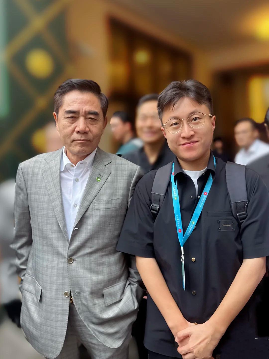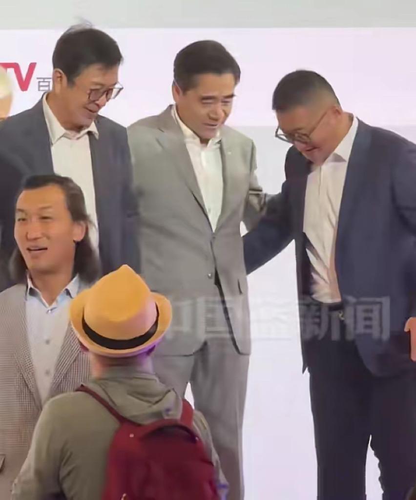 右邊是侯洪亮、左邊是孫忠懷,一個是知名的製片人、一個是影視圈的大佬。他們在陳寶國面前都非常低調、謙卑。