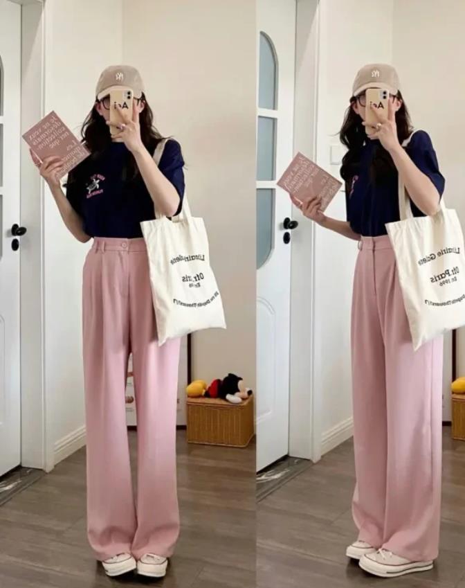 這個簡直就是打工人的專屬搭配啊,藏藍色的polo短袖,肌膚白色的姐妹,就可以大膽穿起來,下裝配一條粉色西裝闊腿褲,記得要把上衣全部塞進褲子裏面,這樣就能打造出利落幹練的造型了,鞋子配上一雙白色帆布鞋,很不失休閒又舒適。