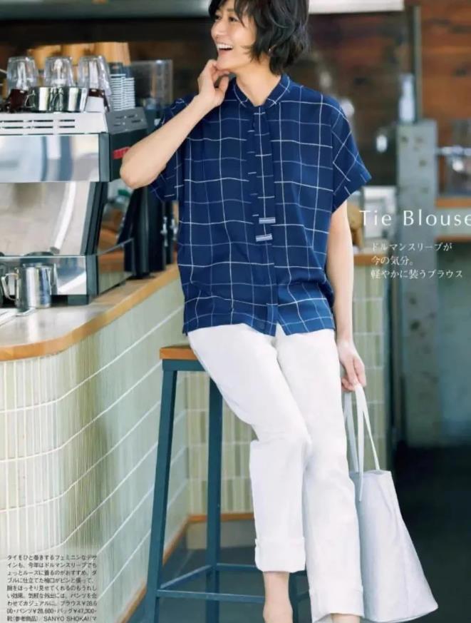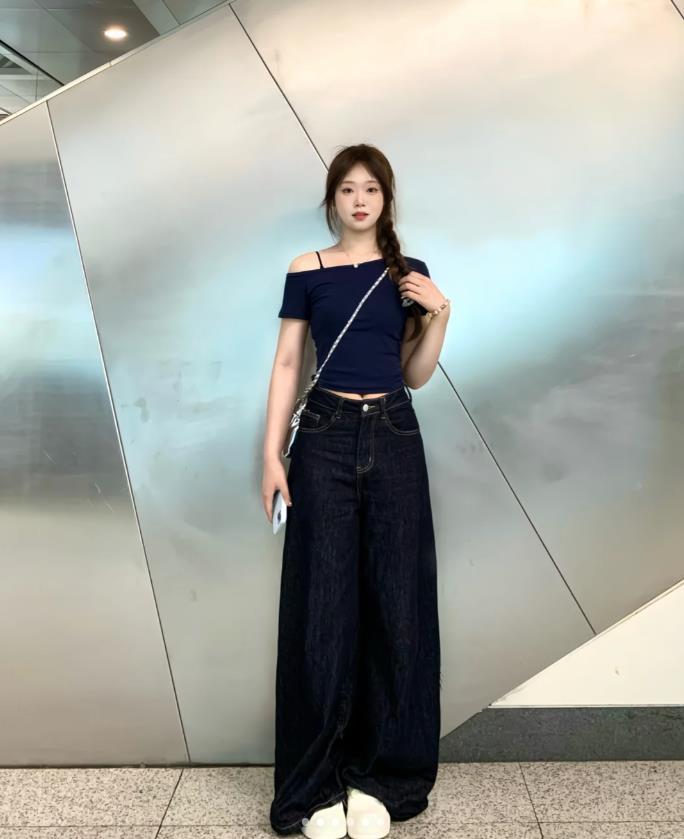 斜肩的藏藍色上衣,真的很適合不想過分露膚的姐妹穿,收腰的設計,把身材修飾得極佳,視覺上瞧着也太顯瘦了,而且藏藍色把膚色襯托得很白皙,褲子是高腰的,加上寬鬆的版型,什麼腿型都能駕馭。上短下長的組合,簡直是梨形身材的標配。