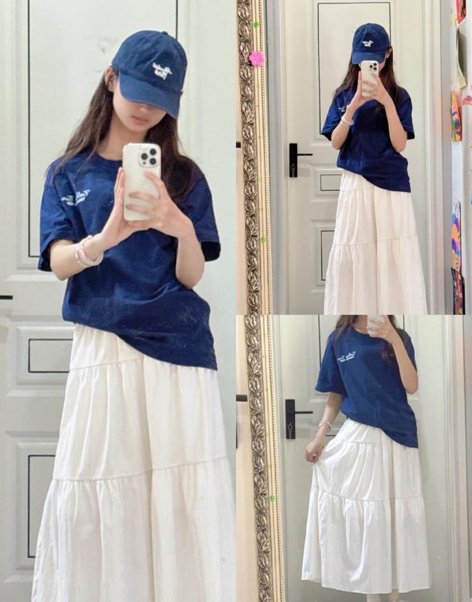 夏天的顯白搭配,還得是藏藍色啊,基礎款的藏藍色短袖t恤,挺簡單的款式,搭配小白裙,一整個穿搭就很夏天了。而且這種半身長裙,自帶仙氣感,鞋子可以配運動鞋,或者是勃肯鞋,很輕鬆舒適自在。