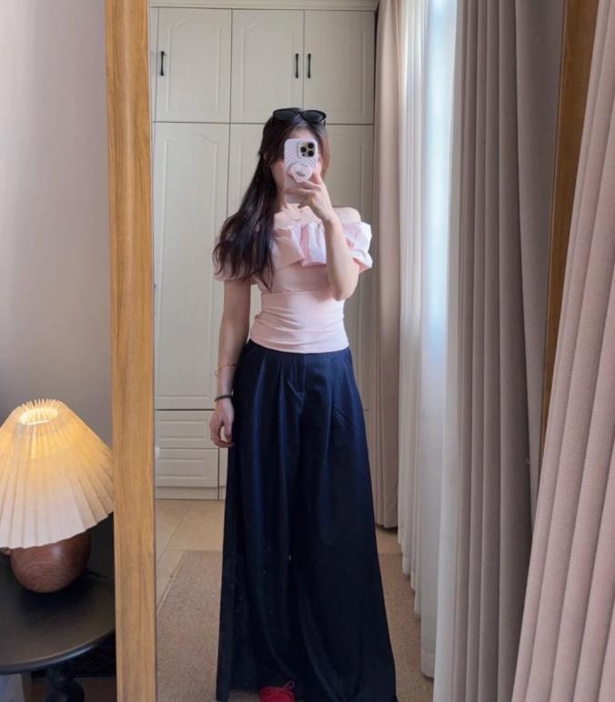 粉色露肩上衣+藏藍色闊腿褲,真的滿滿少女風的一套,淺淺的粉色上衣,很襯膚色和顯白,黃黑皮的女生也能輕鬆駕馭,還有就是闊腿褲的材質很薄也很涼快,長度就算是小個子女生也能輕鬆駕馭。