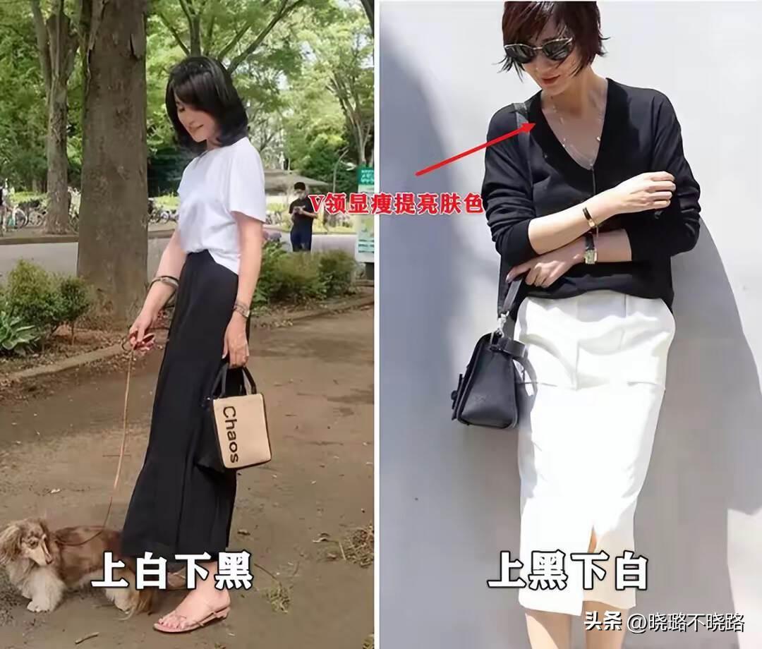 對於上半身顯壯的女性來說,V領款式的黑色上衣,顯瘦效果更好,和膚色形成對比的效果,還特別抬氣色,下身配白色鉛筆裙,知性輕熟又不失優雅氣質。