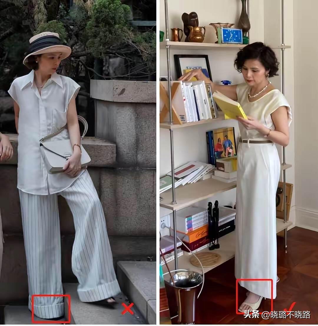 無論是裙子還是褲子,儘量不要選擇拖地款,下襬太長的話,駕馭難度也特別高,很容易出現堆積感,而且在視覺上會有壓個子的現象,更推薦大家選擇及踝不拖地的款式,配雙低跟鞋就很美。
