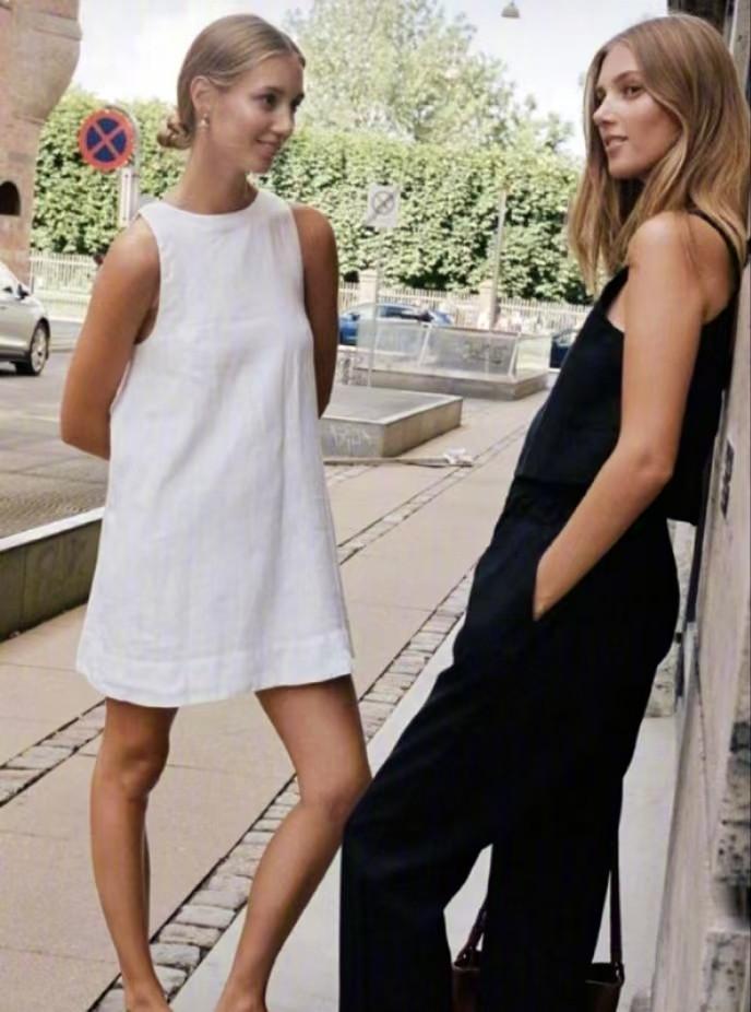 白色寬鬆背心簡約又清爽,搭配淺色牛仔闊腿褲,闊腿版型遮蓋腿部不足,同時帶來隨性灑脫的感覺。腰間繫上一條細腰帶,提高腰線,優化身材比例。腳上搭配一雙平底涼鞋,輕鬆又自在。再戴上一副墨鏡,增添時尚感,適合度假或夏日出行,打造休閒的英倫風造型。