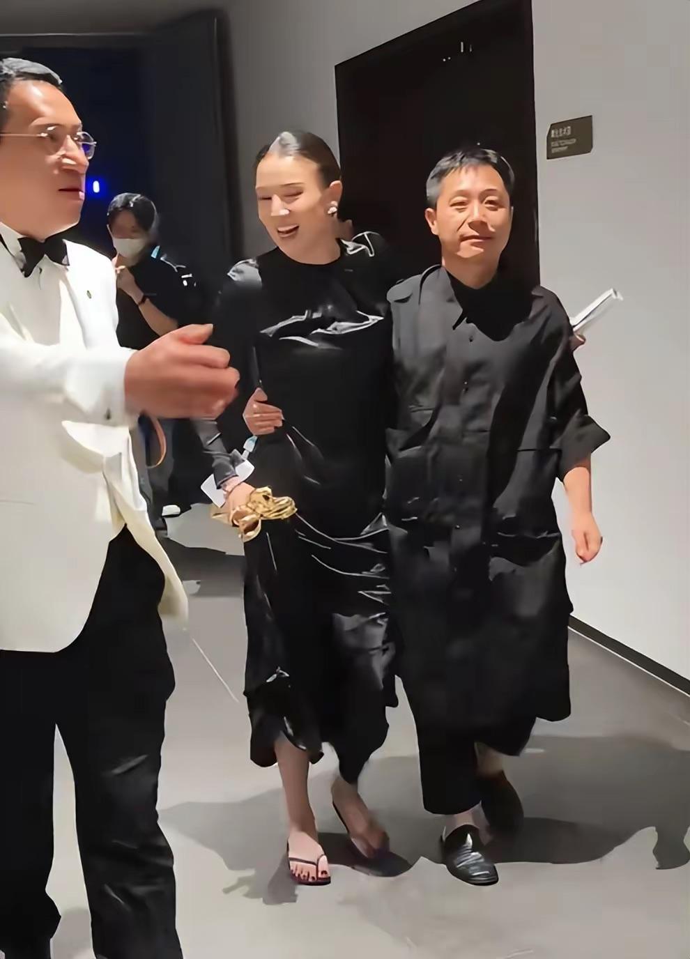 這時候宋佳已經下場,也換上了輕便的人字拖,她一手捧着獎盃、一手摟着男人的肩膀,臉上的笑容燦爛明媚。