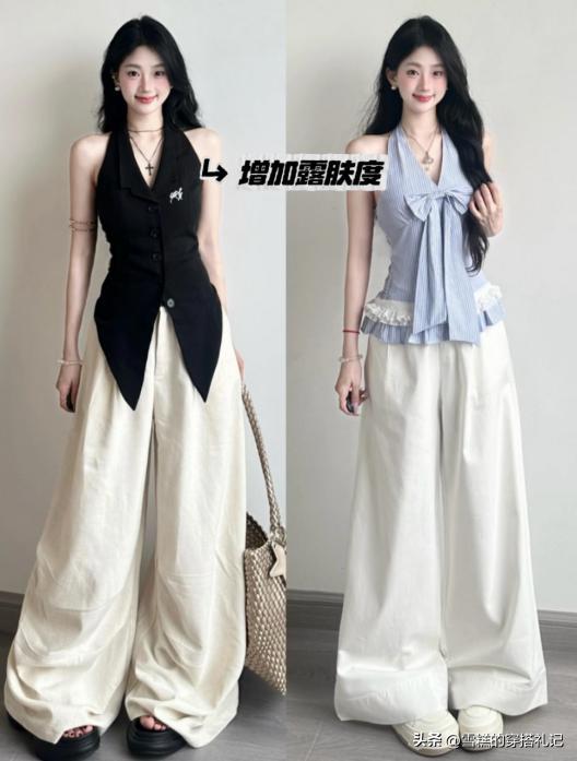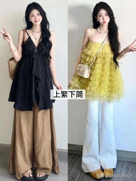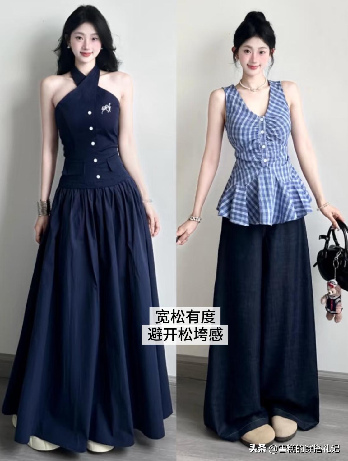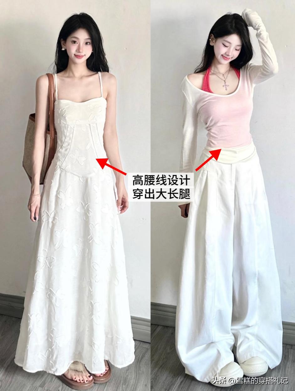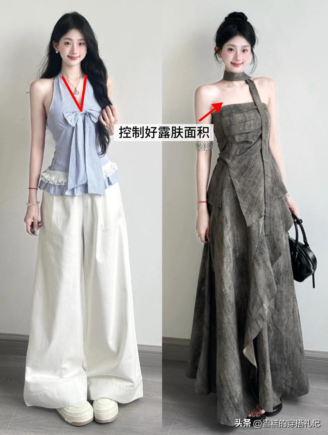 上半身的單品,通常會採用露膚度比較高的設計,通過掛脖、吊帶、抹胸以及露臍長度,增加露膚面積,下半身的單品,包裹性更強,長度會遮住腳踝位置。