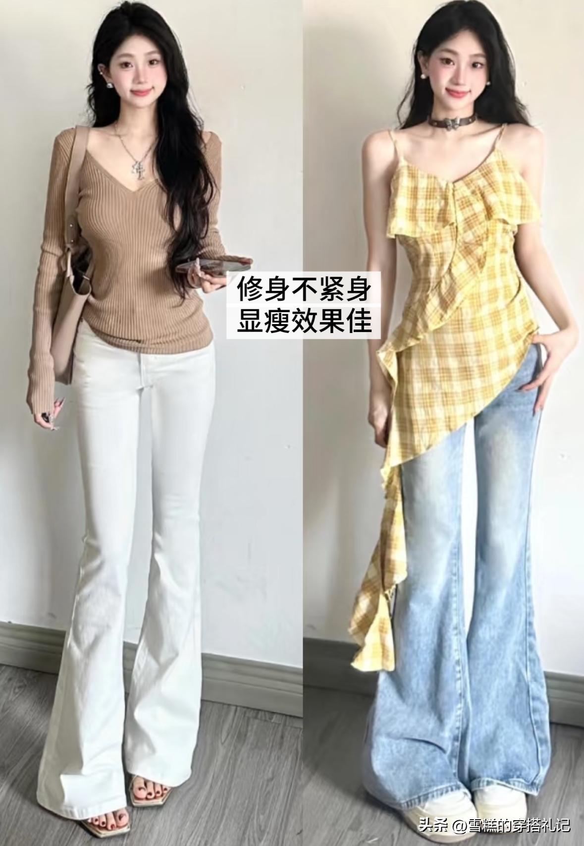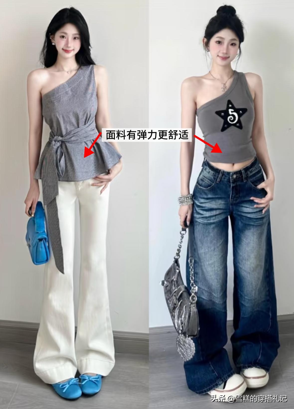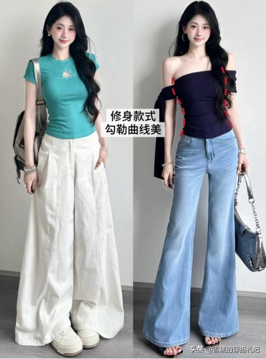 修身款式的一字領、V領或者寬肩帶上衣,更有利於削弱臃腫感,穿出顯瘦的效果,再搭配上寬鬆版型的高腰闊腿褲,分分鐘藏住胯寬、臀肥、腿粗的煩惱。