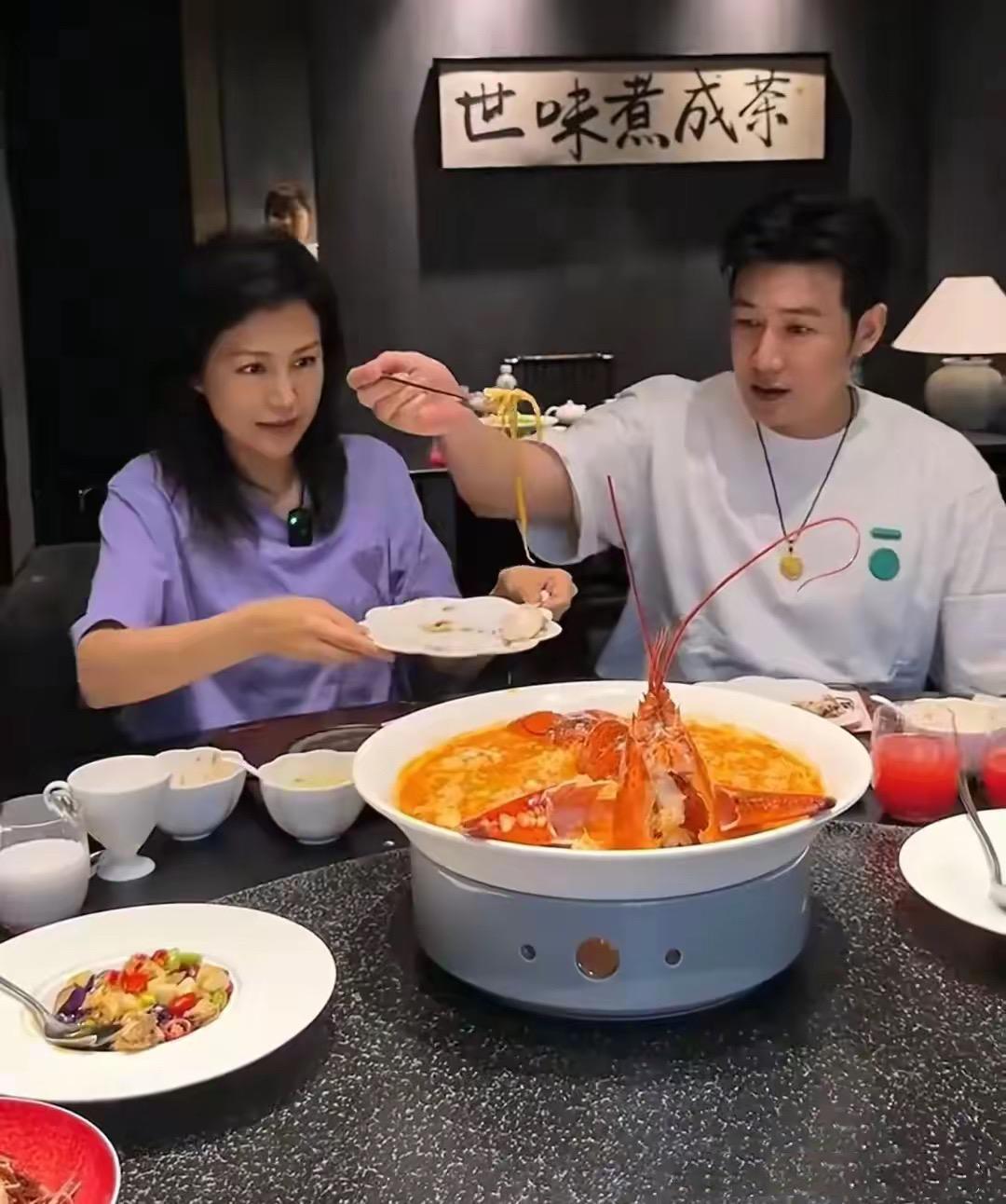 陸毅貼心的給老屁夾菜,這恩愛的畫面任誰看了不羨慕。老夫老妻了,還如此的恩愛,是甜的發膩的感覺。