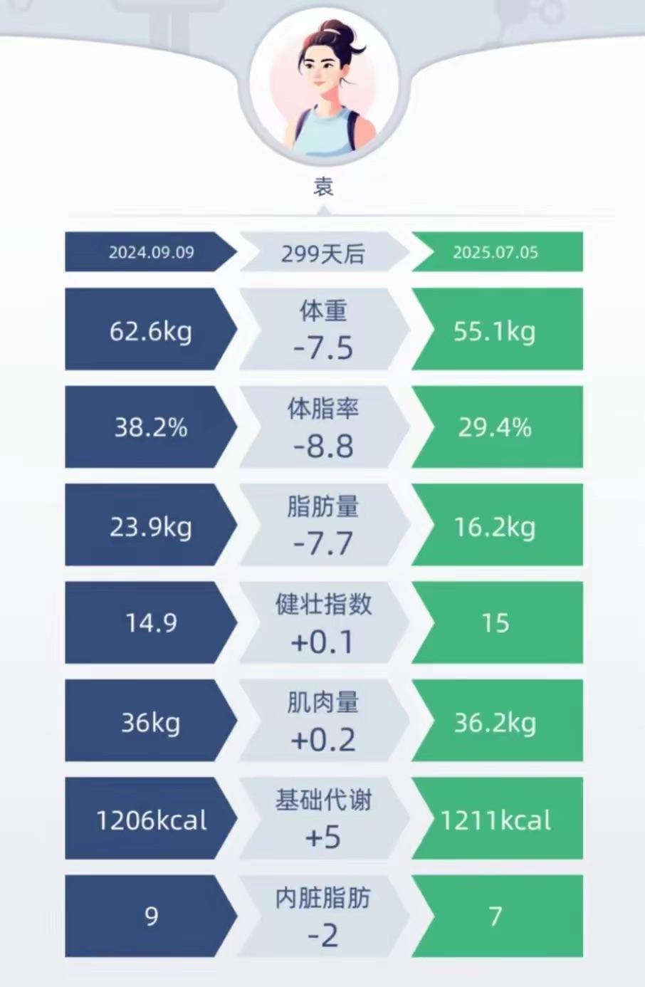 她的體脂率下降了8.8,脂肪量下降了7.7,自從運動健身以後,成效還是非常明顯的。這個成果,已經能讓無數人偷着笑了。