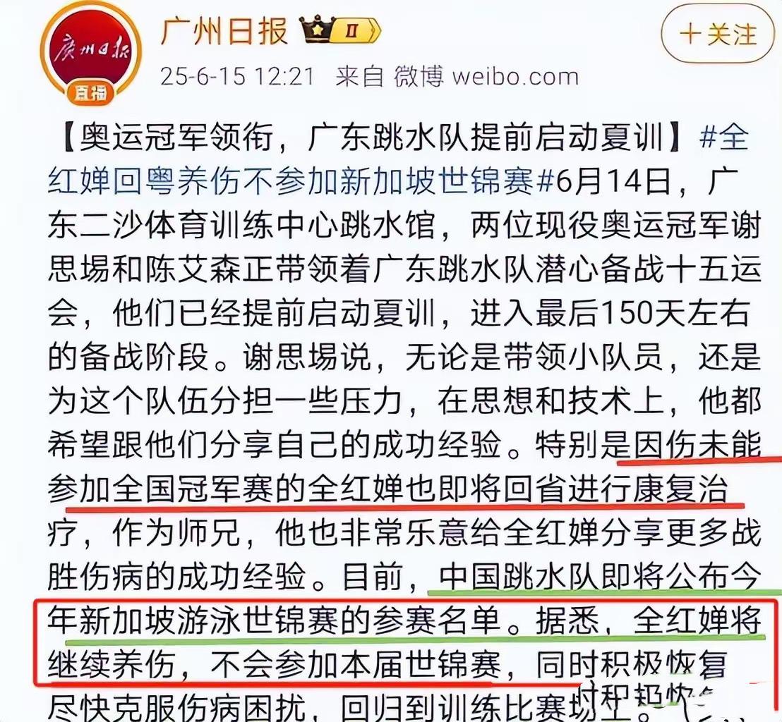 其實早在冠軍賽的時候,全紅嬋就退賽了,那時候全紅嬋就回歸了廣東隊、進行康復訓練。而康復訓練並不是一天半天就能見到成效的。