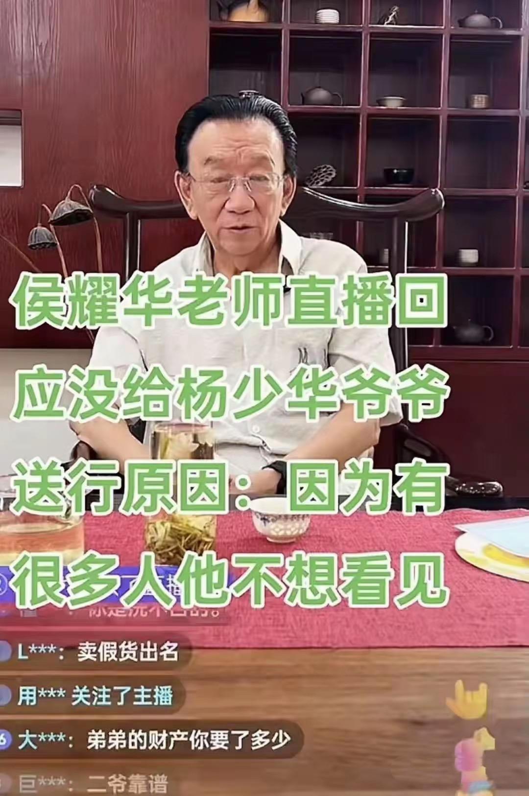 楊少華頭七這天,侯耀華剛好開了直播,只見他穿着一身黑色西服坐在鏡頭前,打扮的非常考究。穿成這樣,大概是爲了表示對楊老先生的尊重。