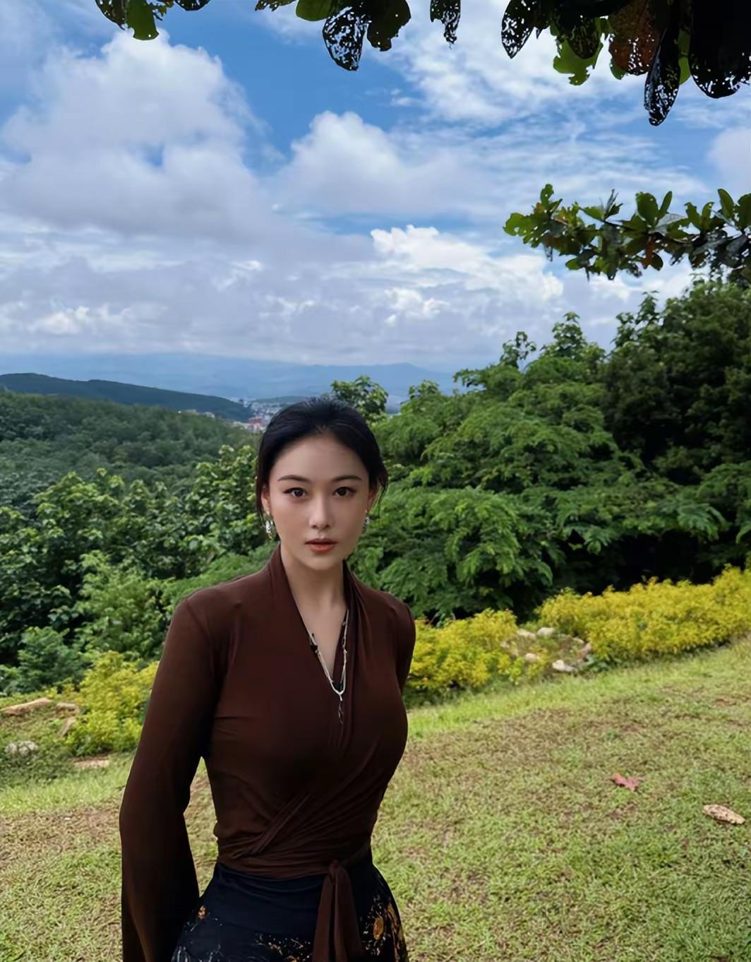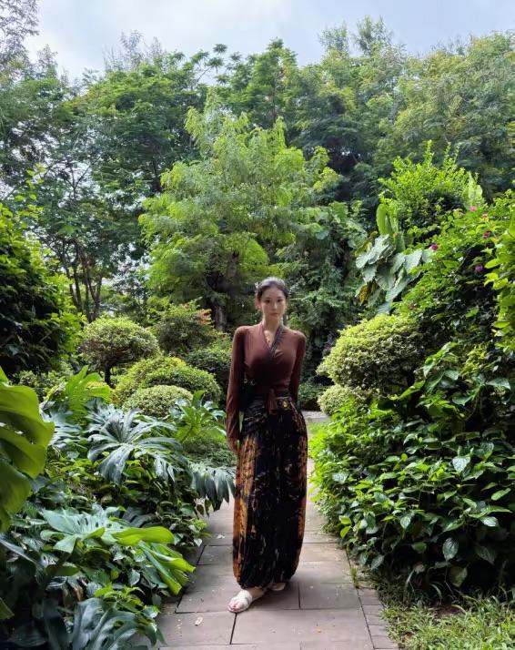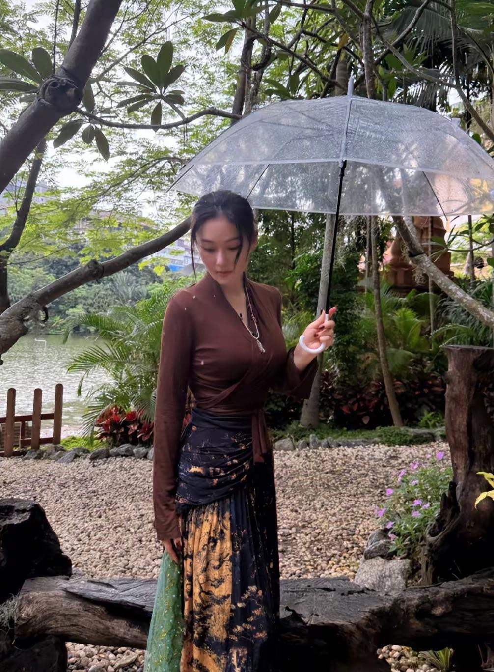 西雙版納的風景正好,叢林裏也很清涼。張馨予穿着長袖的衣裙,還撐着一把透明的雨傘,這個畫面太唯美了。