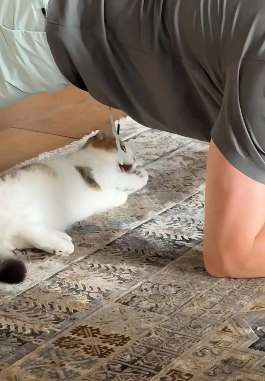 即便是在何捷健身的時候,他們養的小貓也會在下面搗亂。看小貓咬着何捷衣服上的帶子,真是太調皮了,何捷一身腱子肉真健壯。