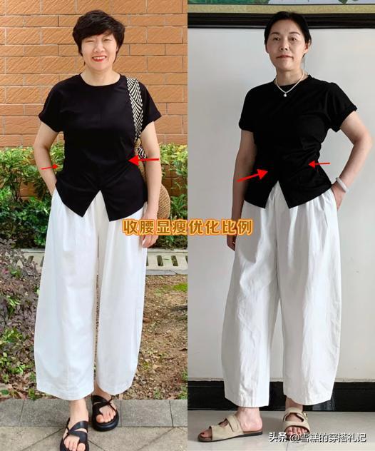 白白短袖屬於純白色的單品,穿在身上不會像黑色那麼顯瘦,大部分中年女人的身材不會像年輕時那麼好,那麼選白色短袖想要顯瘦度,就從它的版型款式入手。首先,避免穿太寬鬆或者太緊身的白短袖,它在視覺上都容易顯胖,其次建議從白短袖的領口設計入手,不要選小圓領,顯得臃腫並且胸大的女人穿很難看,採用V領和大U領,顯瘦度立馬提升。