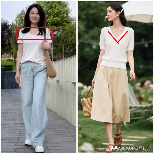 →白短袖想要視覺上顯瘦,就選對衣服版型,建議採用V或U領口的設計